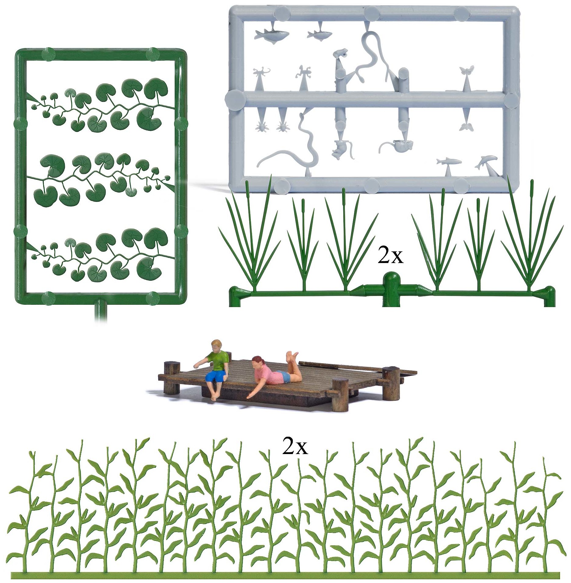 For the realistic animation of your model world. With themed accessories and at least one figure (painted finished model) in the right position. From the jetty, the children can watch how the fish swim to the surface of the water and snatch the food from each other. Set with 2 children, boat jetty made of real wood, aquatic plants (kits for water lilies and various grasses) and small animals (to paint yourself).