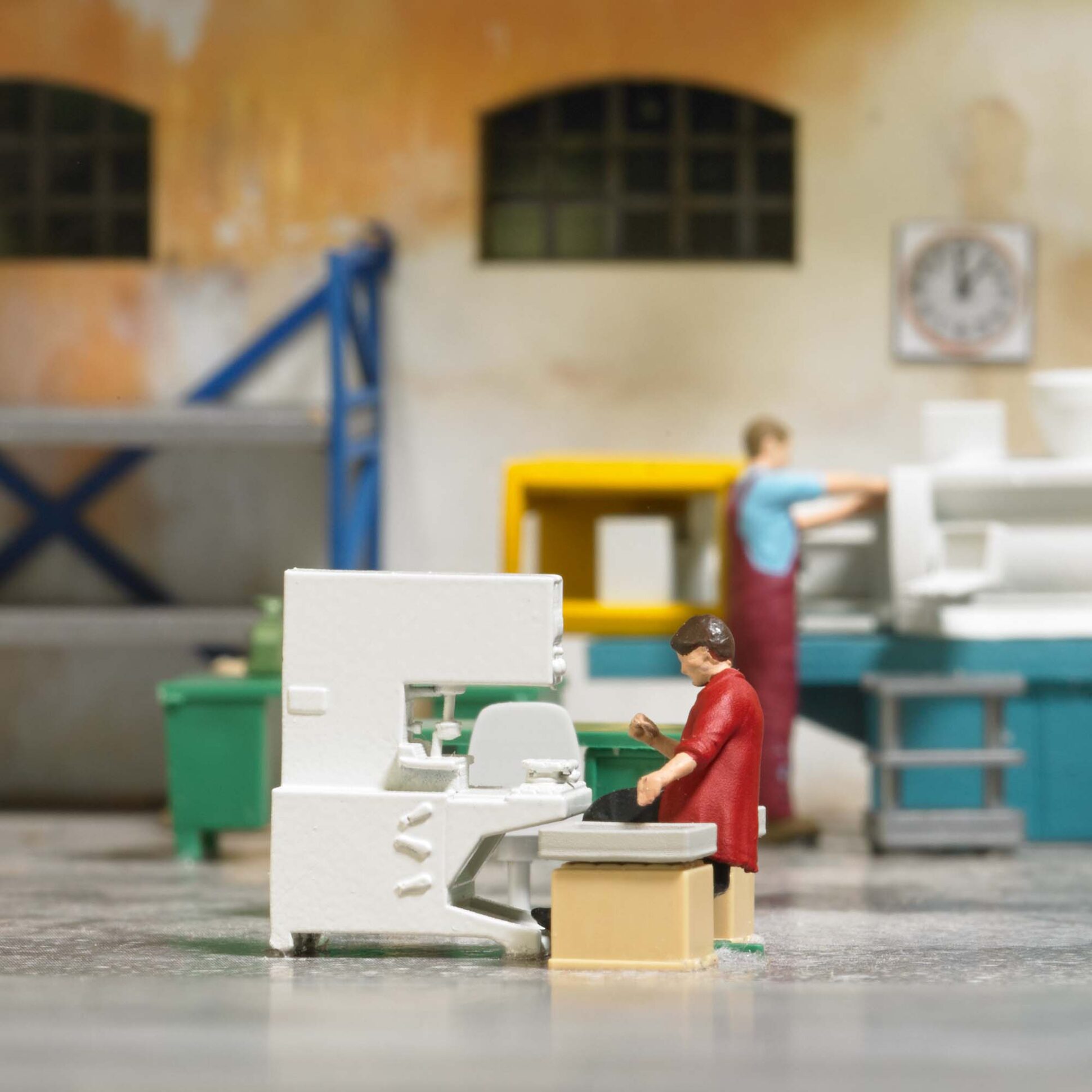 This employee is responsible for inserting and checking components on the pad printing machine. The set also contains a desk, chair and boxes as well as cut-out sheets for designing the workplace.
