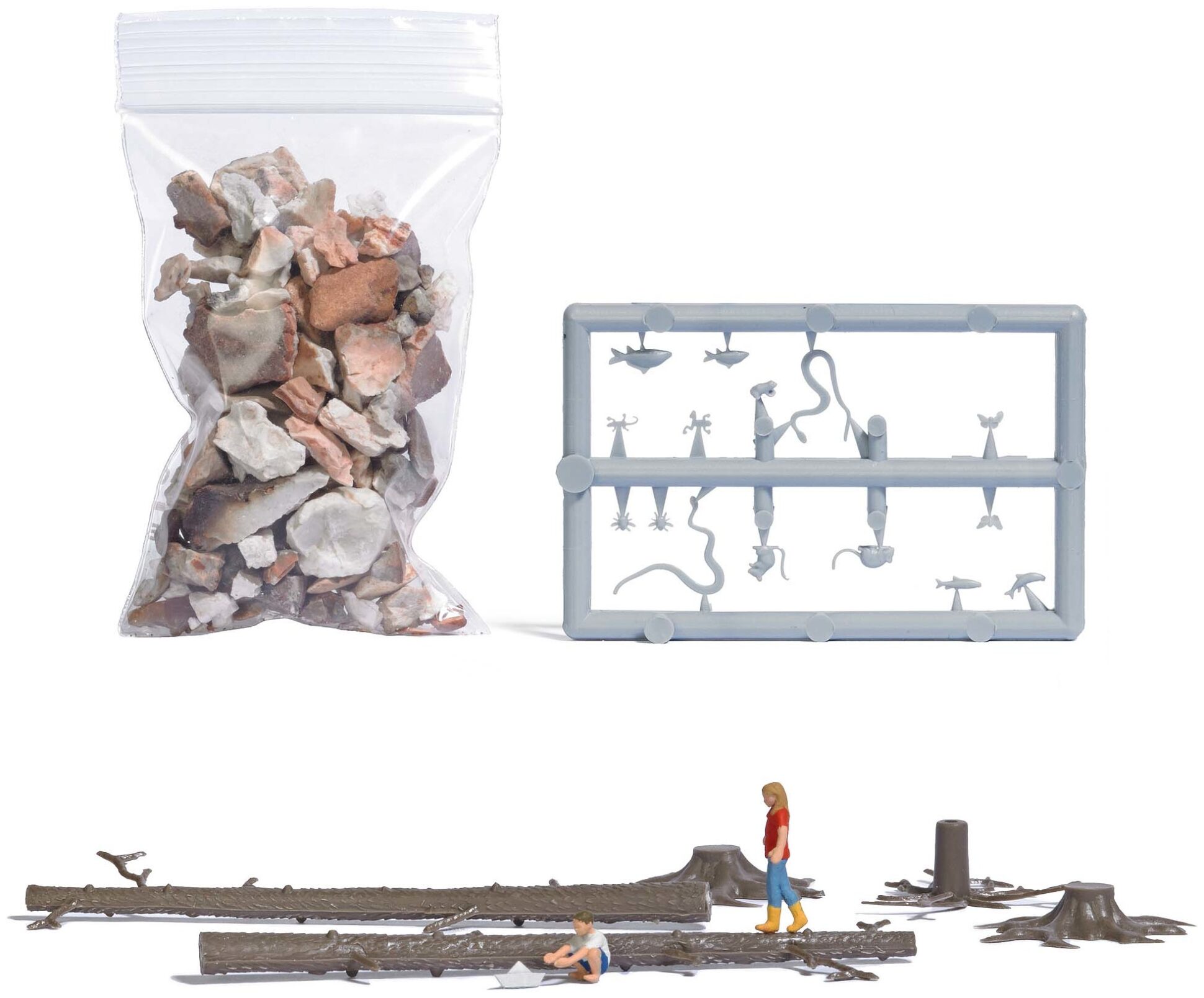 For the realistic animation of your model world. With themed accessories and at least one figure (painted finished model) in the right position. Water games are great fun for children! They balance over the stream, launch paper boats, collect stones and much more. Set with 2 children, mini boat, various small animals such as insects, mice, snakes and fish (to paint yourself), tree trunks, roots and stones to design a torrent.