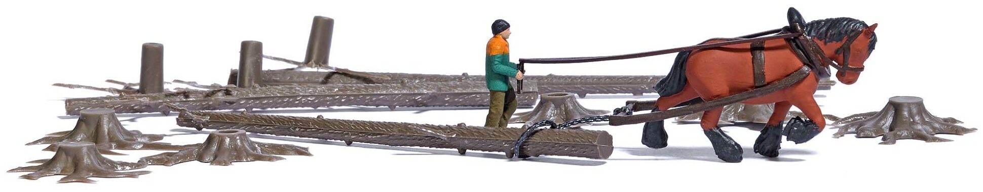 For the realistic enlivening of your model world. With thematic accessories and at least one figure (painted finished model) in the right position. The show log hauling shows how felled trees were transported out of the forest in the past. Today, the use of horses is increasingly being used again to protect the forest floor. Set contains horseman with cold-blooded horse including hauling equipment and tree trunk as well as loose roots, branches and tree trunks. Perfect for eras 5 and 6.”