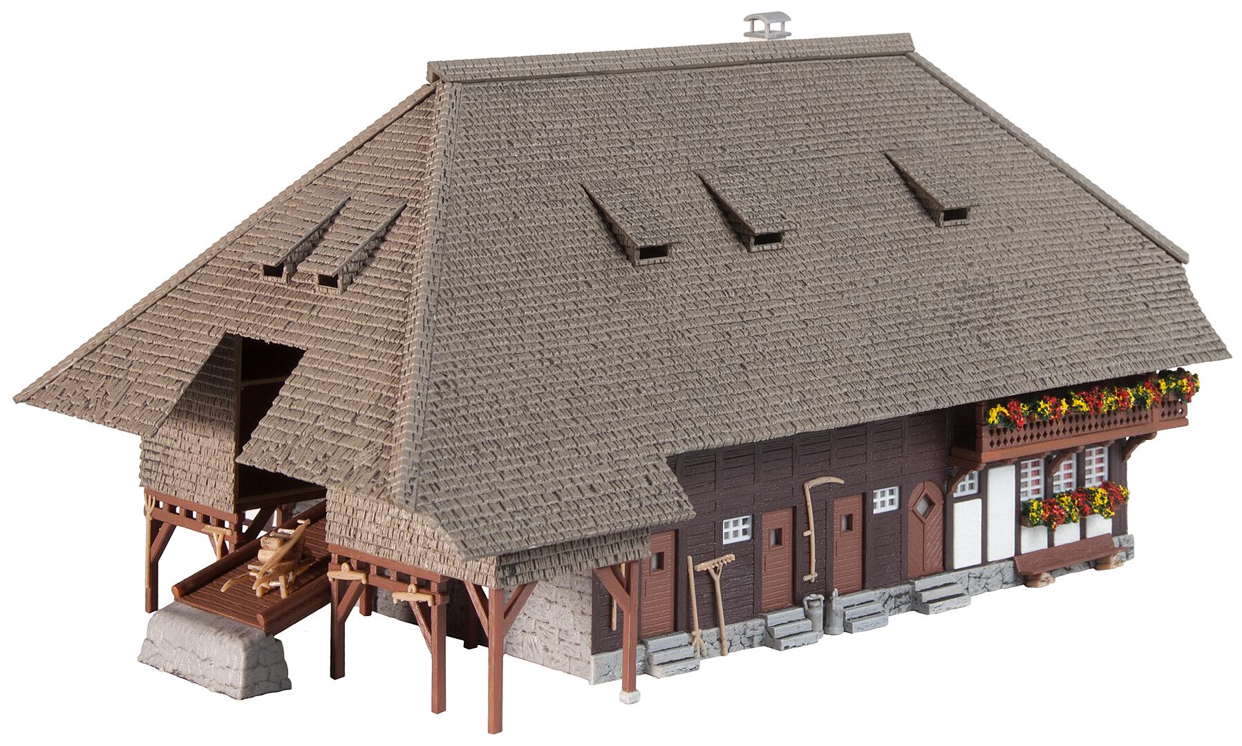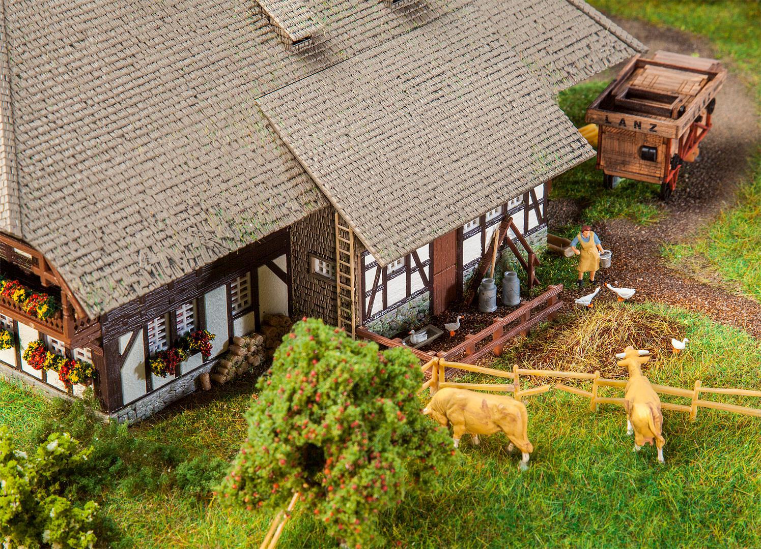 The large, two-storey Black Forest farm brings some Black Forest charm to the miniature set with its traditional half-timbered construction and the lowered crippled hipped roof. Numerous matching accessories are included, including a cistern used as a flower trough, scythes, ladders and other lovely decorative elements that perfectly complement the model.