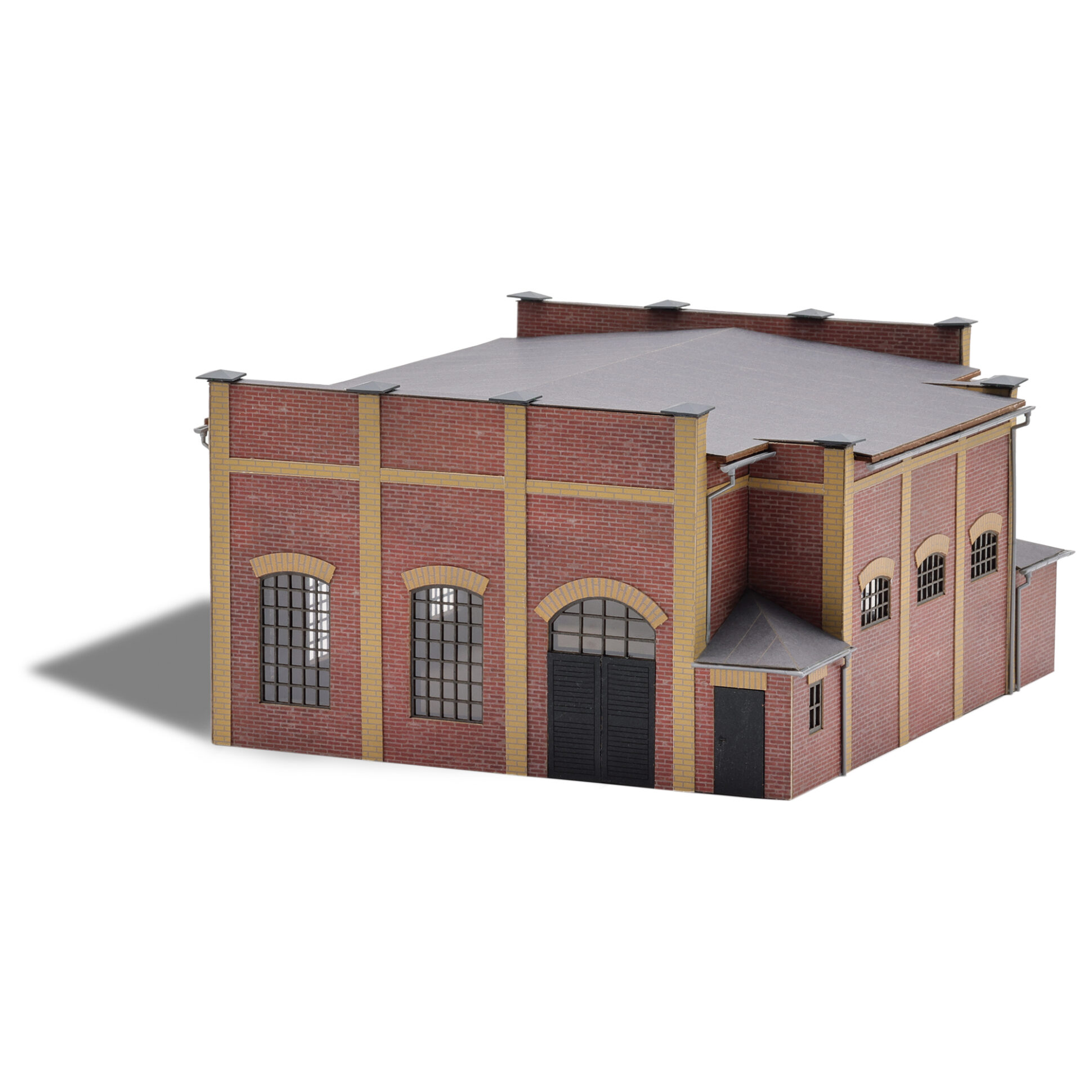 An open, transparent glass construction, with three stalls, suitable for engines up to 310 mm length over buffers. The doors can slowly open and close by building in a drive unit (Faller. 180624, 12-16 V AC/DC voltage – unit not included). Mechanical parts attached. Suitable for use with a traverser and all sorts of tracks. Catenary operation possible. Several models can be juxtaposed