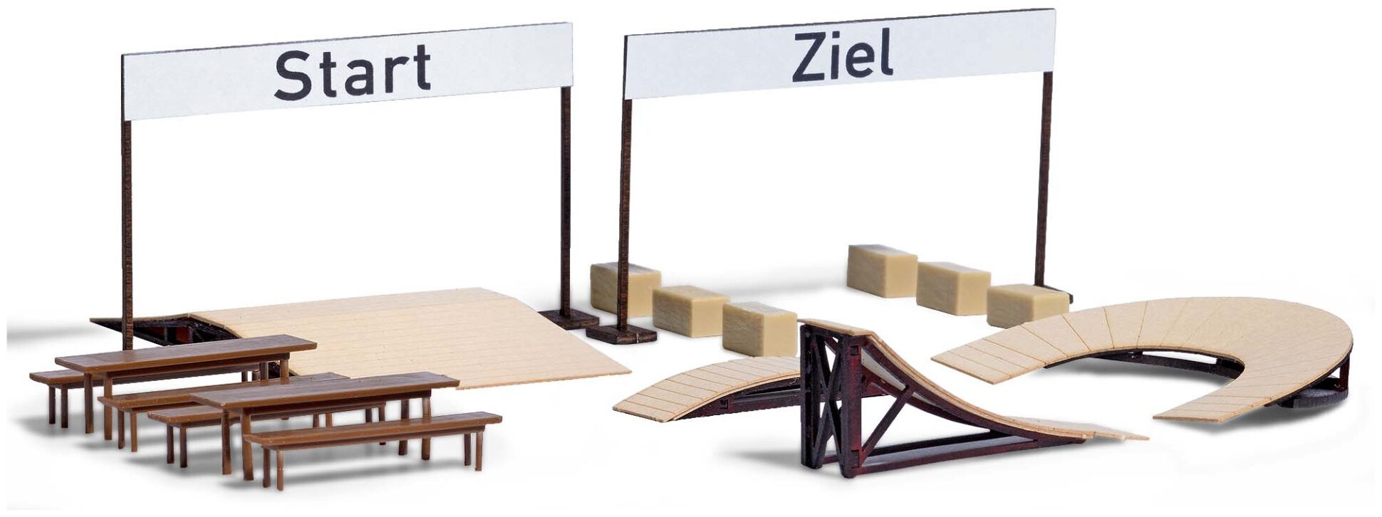 Kit for designing a bike trail on flat or mountainous terrain. With the start-finish markings, several obstacles and various trail elements made of wood, the bike trail is perfect for individual design wishes.