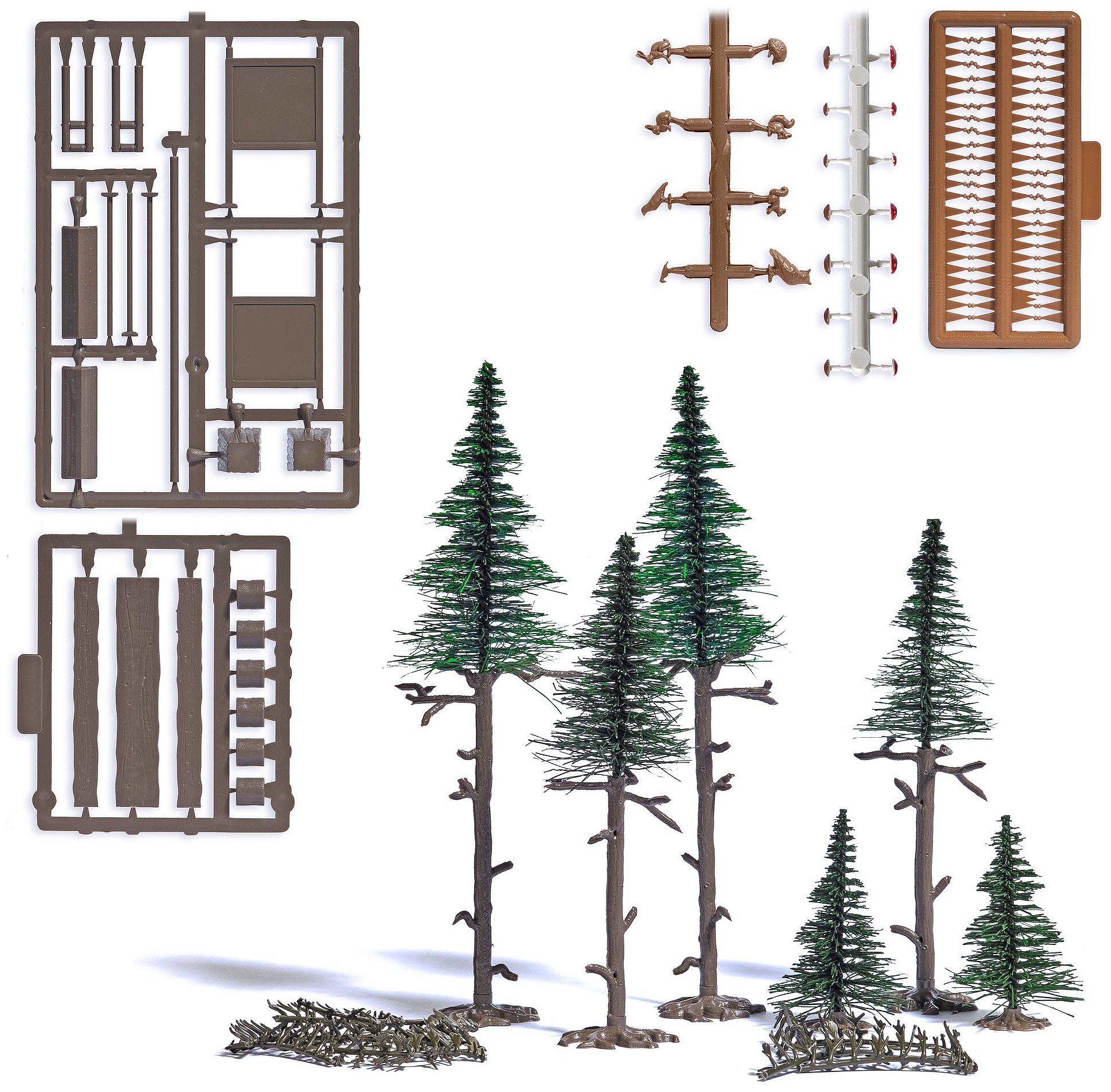 6 spruce trees in three heights create a small high forest with a habitat for animals and plants. The kit also contains dead, dried branches (e.g. for forest floor), a wooden table with 2 benches made from tree trunks, 6 wooden stakes for seating or fencing, 2 large, covered information boards (e.g. for a forest nature trail), a wooden barrier for blocking off forest paths, 2 waste baskets, spruce cones in various sizes, 8 small forest animals (squirrels, woodpeckers, owls, hedgehogs, rabbits, etc.) and 14 mushrooms.