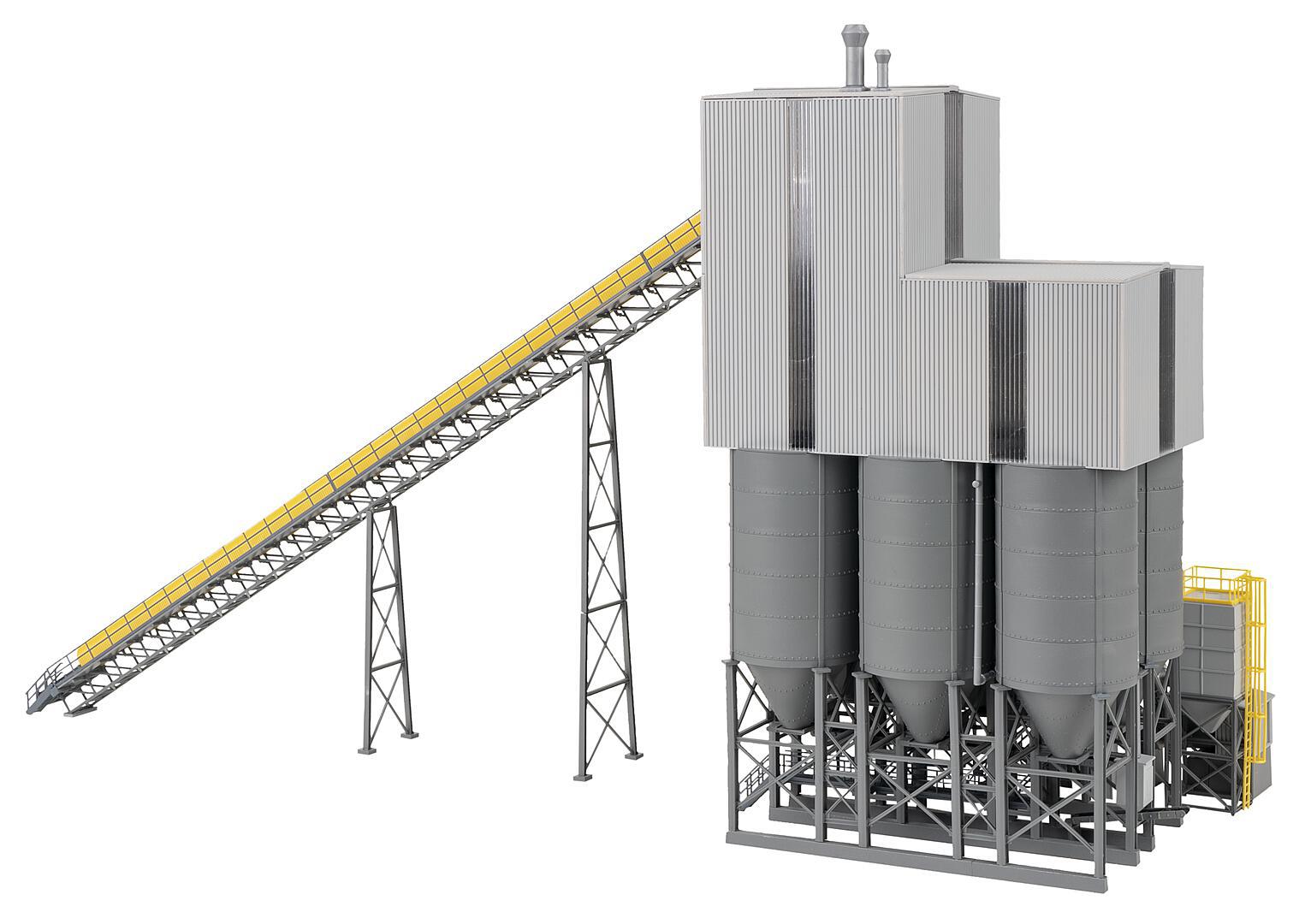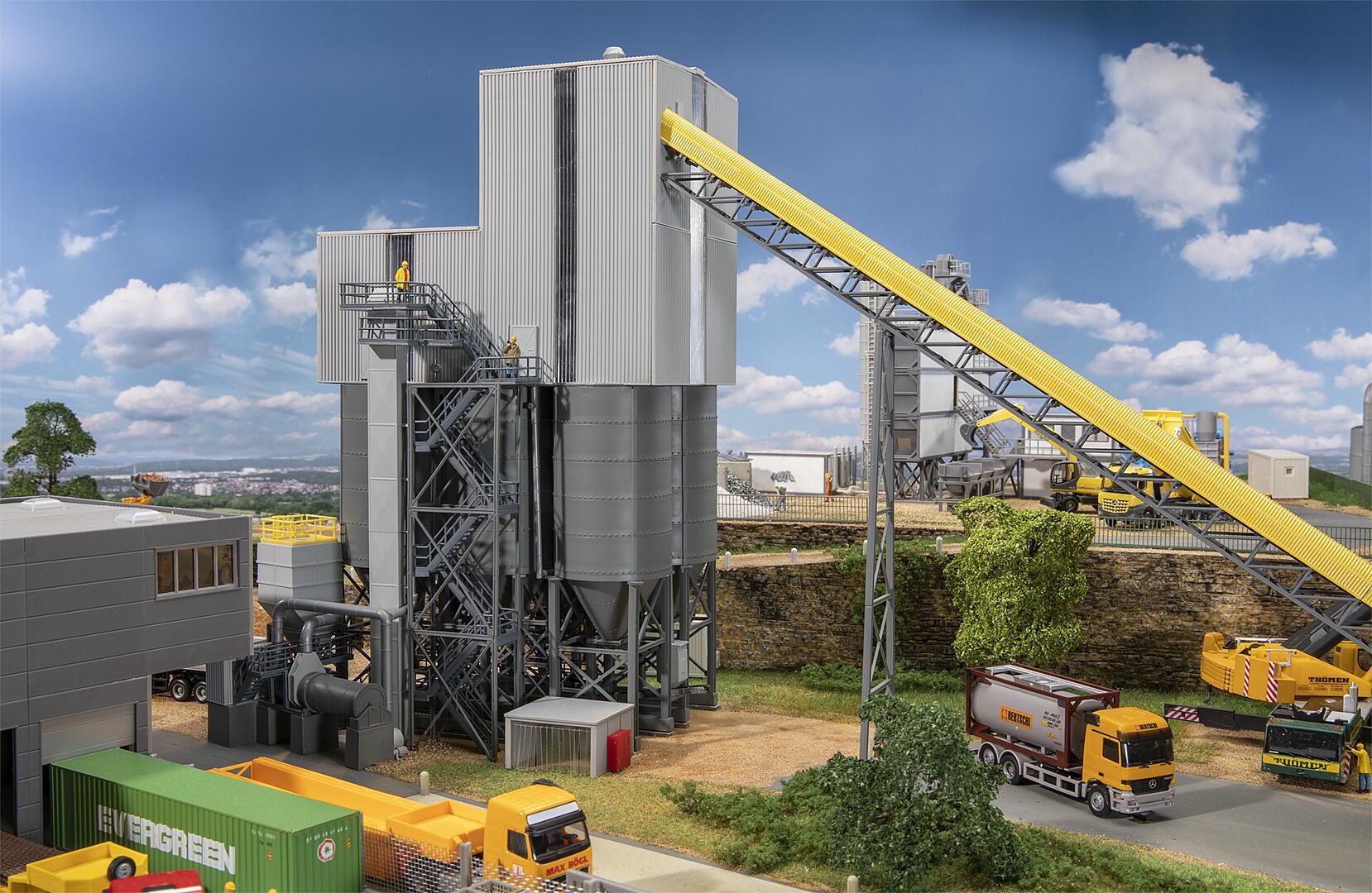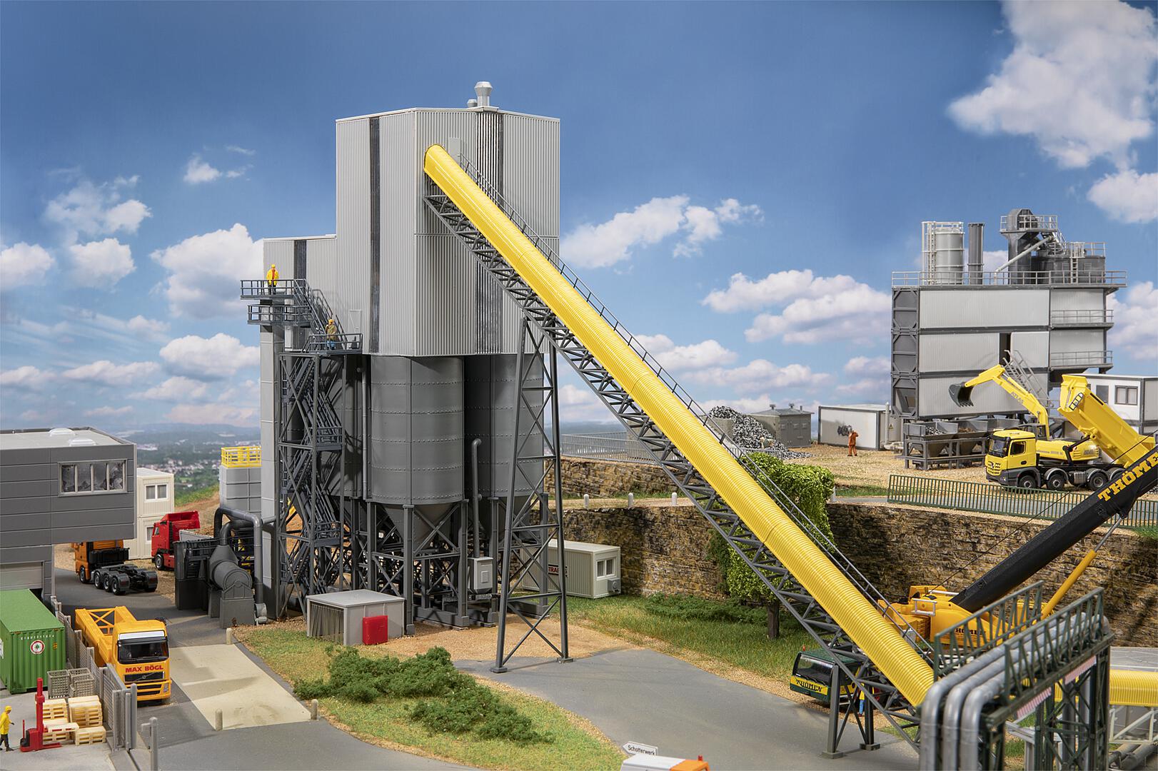 Large gravel works with an enclosed processing plant, six storage silos, loading lanes, an elevator, a long conveyor belt with a hood and various platforms, catwalks and stairs for the workers. The model can also be used in tunnel construction projects to show the further processing of the excavated rock material. Model without function.