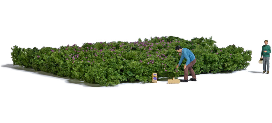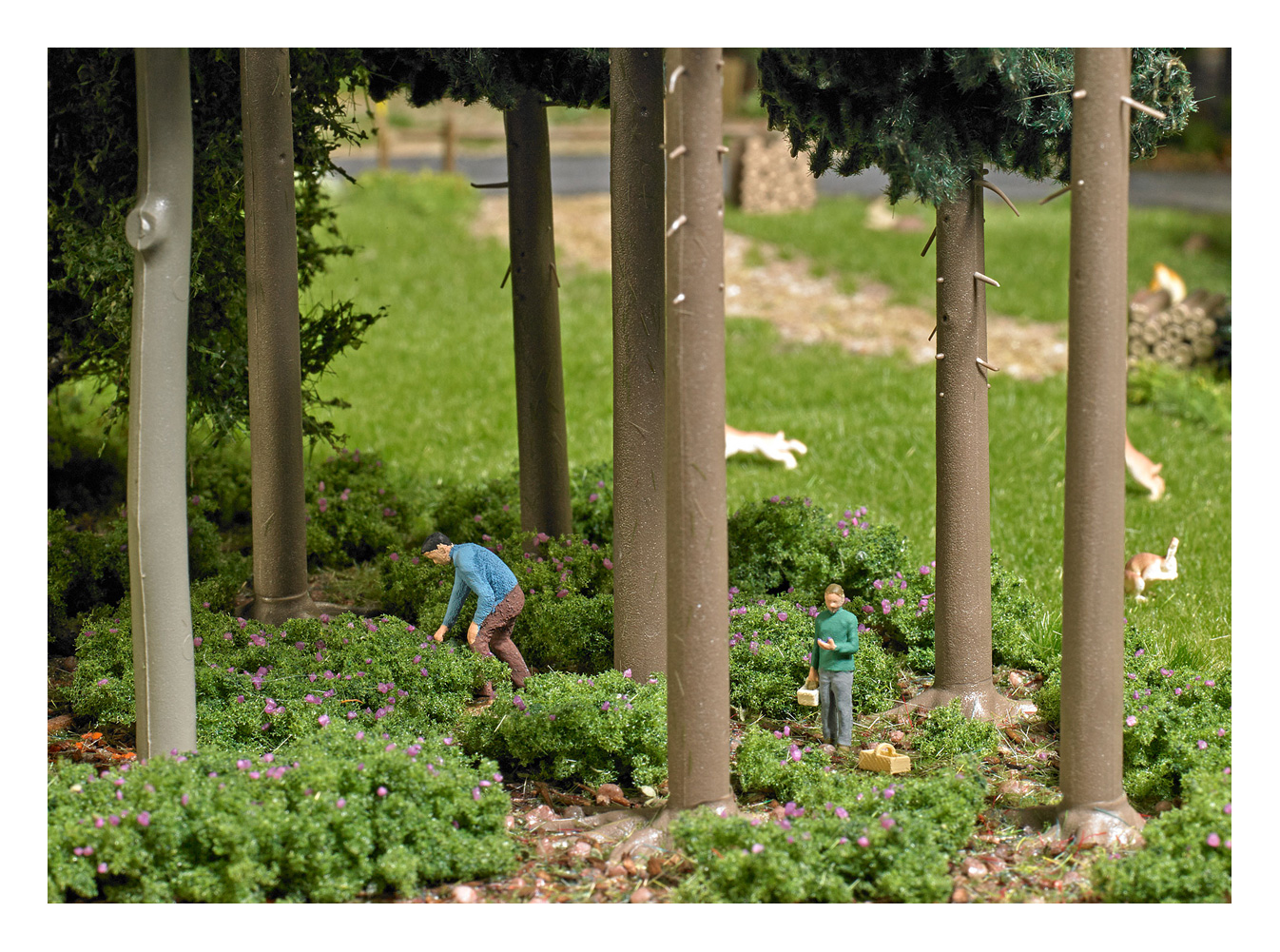 Man and girl picking berries from a field of forest blueberries (approx. 80 x 7mm). With filled and empty collection baskets.
