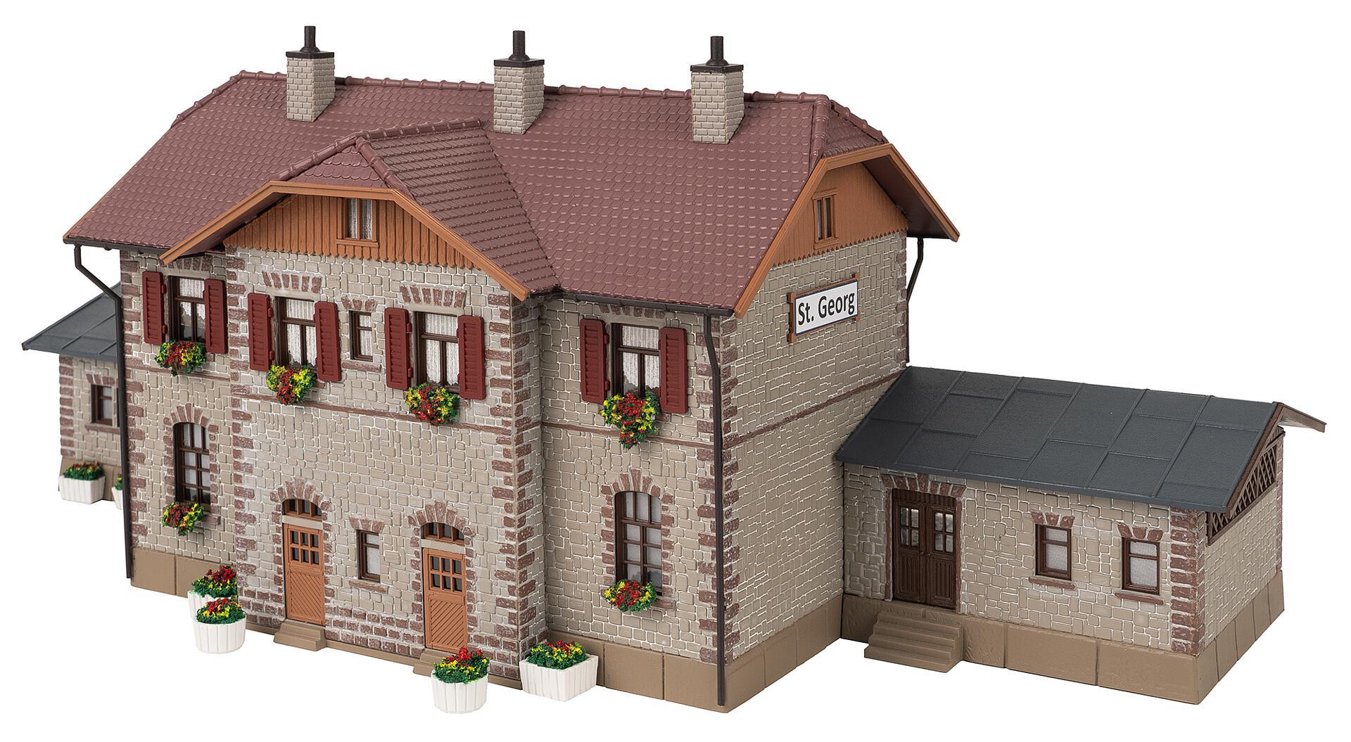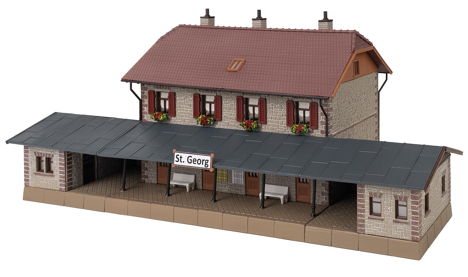 Typical small-town railway station in natural stone. Lavishly equipped with a covered platform and matching waiting benches.