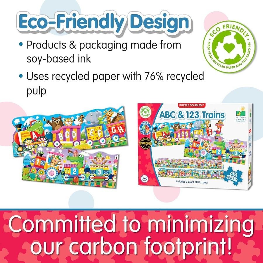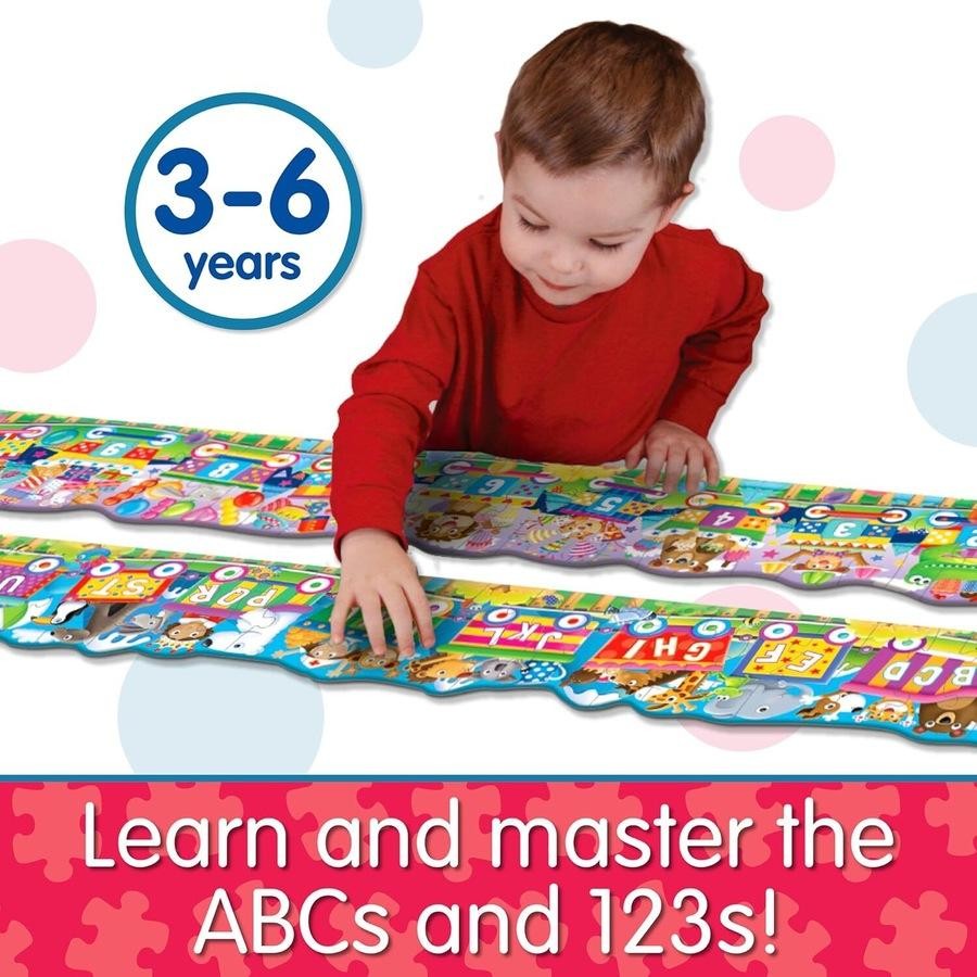 The Puzzle Doubles! Giant ABC & 123 Train Floor Puzzles include two five-foot long, 30-piece colourful cargo train puzzles teaching the alphabet, counting and number recognition.